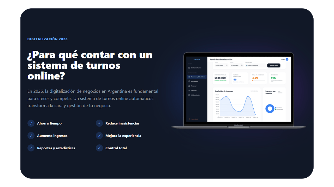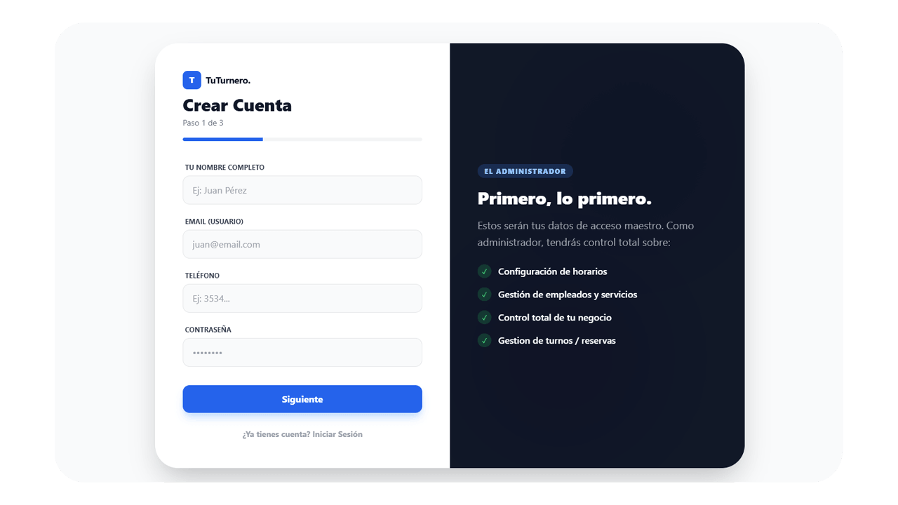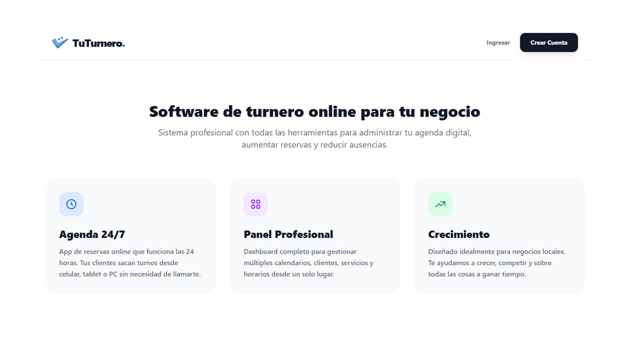 TuTurnero es una plataforma web integral diseñada para automatizar por completo la gestión de reservas de cualquier negocio. El objetivo principal de este proyecto fue crear una herramienta intuitiva que elimine las horas perdidas coordinando citas por mensaje, permitiendo a los dueños enfocarse 100% en su trabajo mientras su agenda se llena sola, las 24 horas del día.